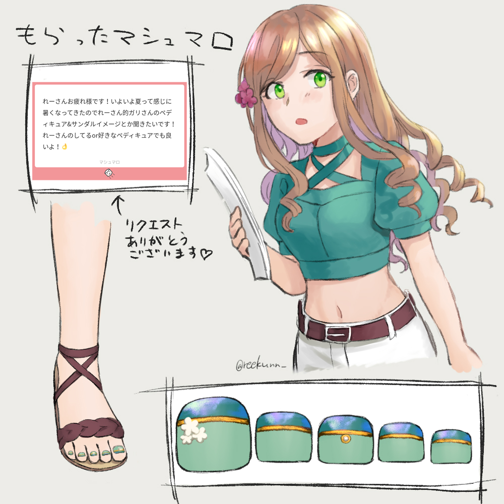 5 18 だいぶ前に貰ったマシュマロの絵をついに完成させました!素敵なお題感謝です!待たせて申し訳ない! マシュマロを貰った当時はチラシ配りをするガリ姐さんに囚われていたのでその衣装イメージで描きました。 ペディキュアとかサンダルとか詳しくないので変なところあっても許してください! 22/08/28 23:43