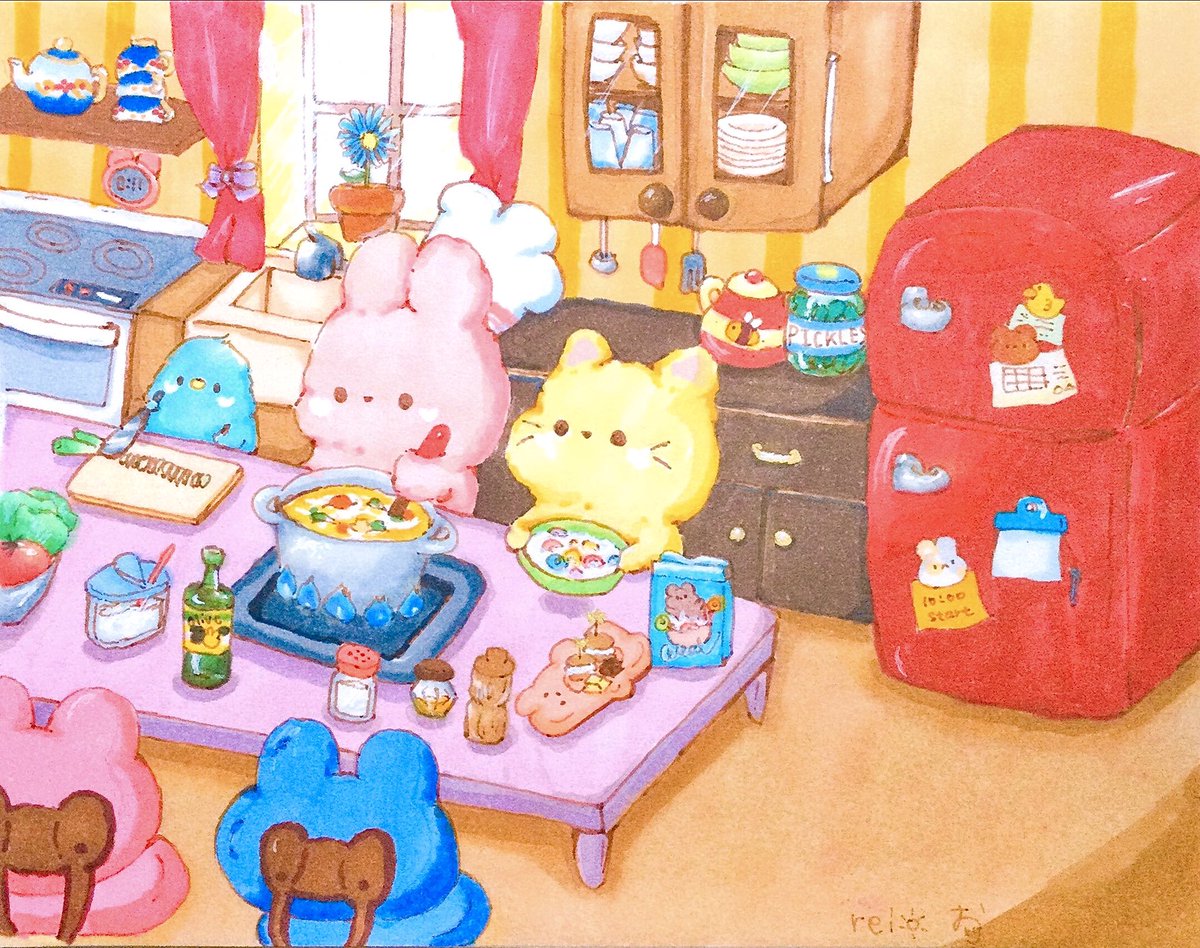 ようやく完成したキッチンのイラスト✨新たに購入したohuhu81色をたくさん使ってみました!濃い色に慣れなくて苦戦💦 #アナログイラスト #illustration #ohuhu美術部 #ゆるいイラスト #イラスト王国 #イラスト好きさんと繋がりたい