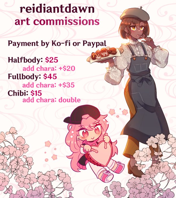 [RTs appreciated!💗] Just a sleepy artist who finally updated her comm sheets 💕 If you're interested, feel free to DM! More in-depth ToS and art samples can be found hereー reidiantdawn.carrd.co