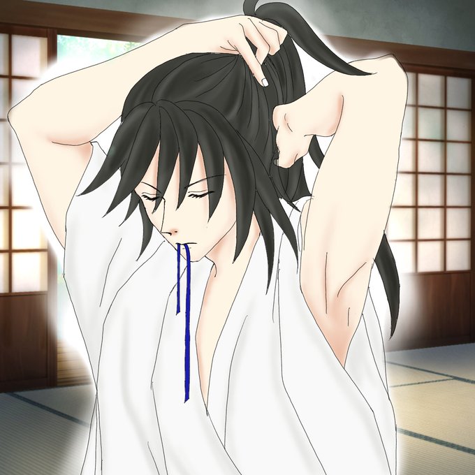#義炭版真夜中のお絵描き60分一本勝負 #義炭 【結ぶ】朝の支度で髪を結ぶ🌊。🎴はいつか自分が結びたい…とおもいつつ、見とれてます。