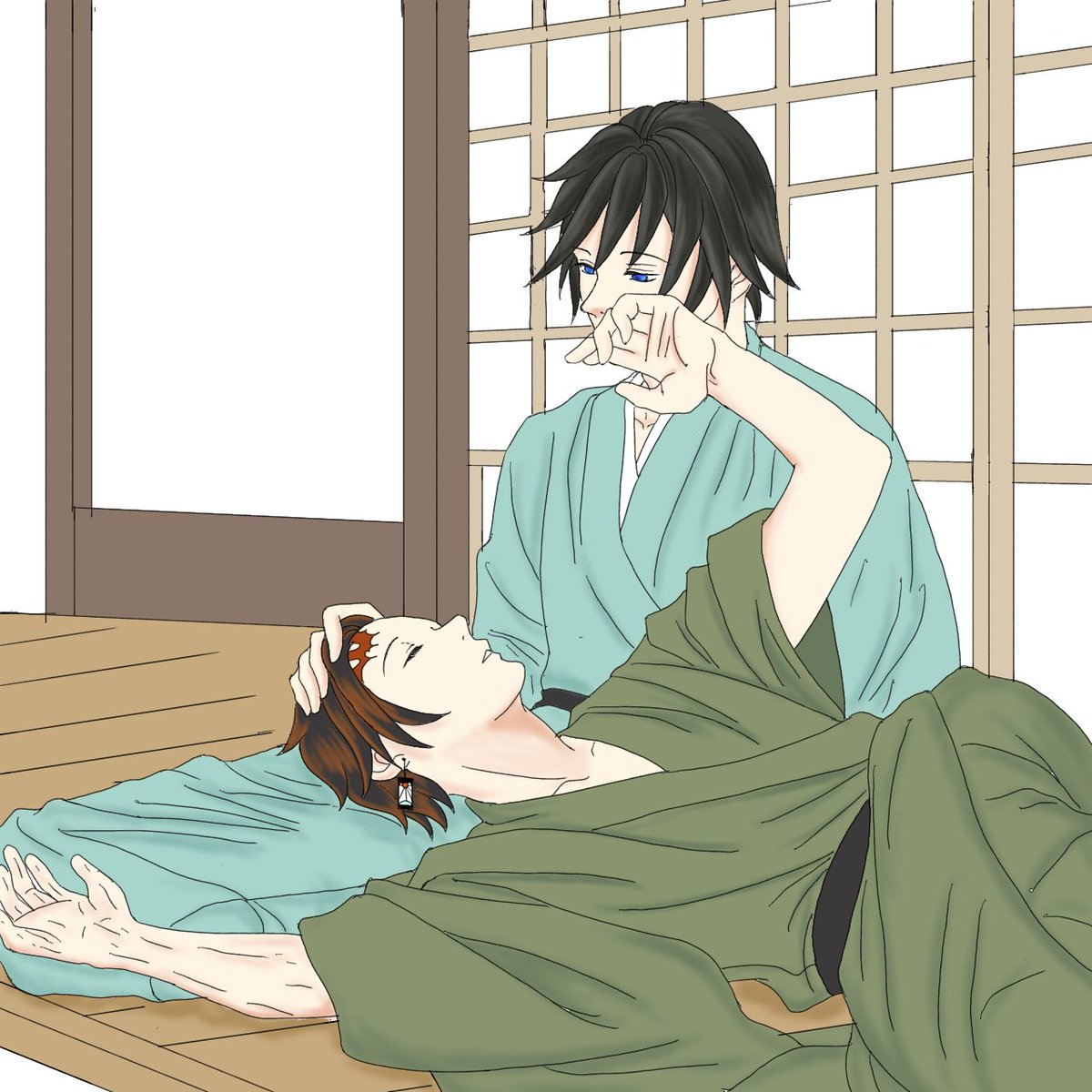 #義炭版真夜中のお絵描き60分一本勝負 #義炭 過去のお題から「ムフフ」。🌊さん、いつも絶妙のタイミングで🎴のところに現れるし、任務以外は陰で見守っているのでは!?