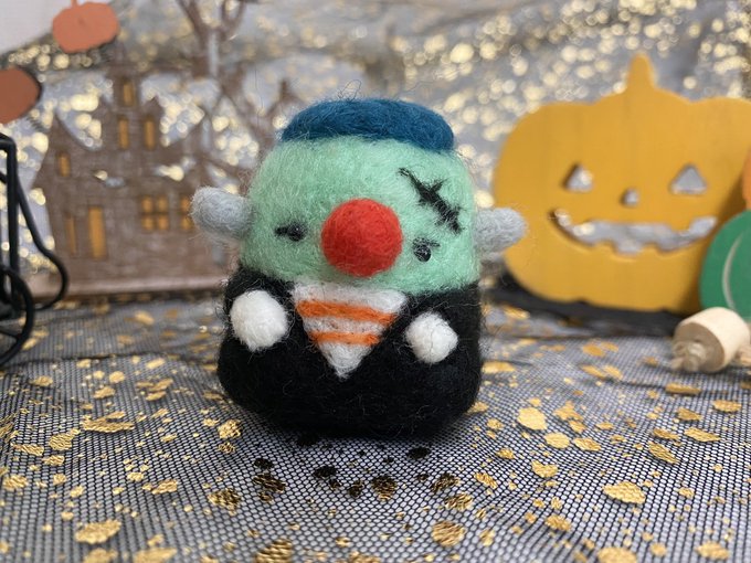 🎃🦇🕸 (・🔴・) 「フランケンだよ👻」 「お化粧頑張ったんだ〜✨️」 #羊毛フェルト