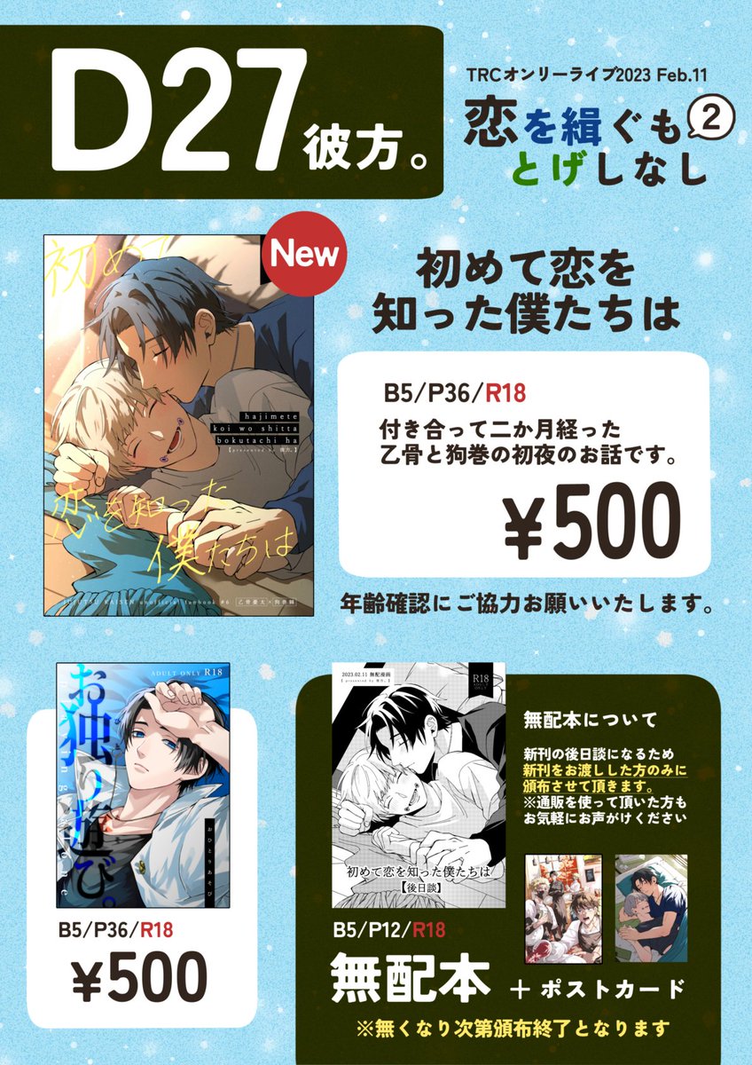 2/11 恋を緝ぐもとげしなし2 お品書きと当日飾るポスターです、よろしくお願いいたします🙋 (もしポスター貰ってくださる方いらっしゃれば気軽にお声がけください☺️) 新刊のサンプルはコチラです👉️pixiv.net/artworks/10494…