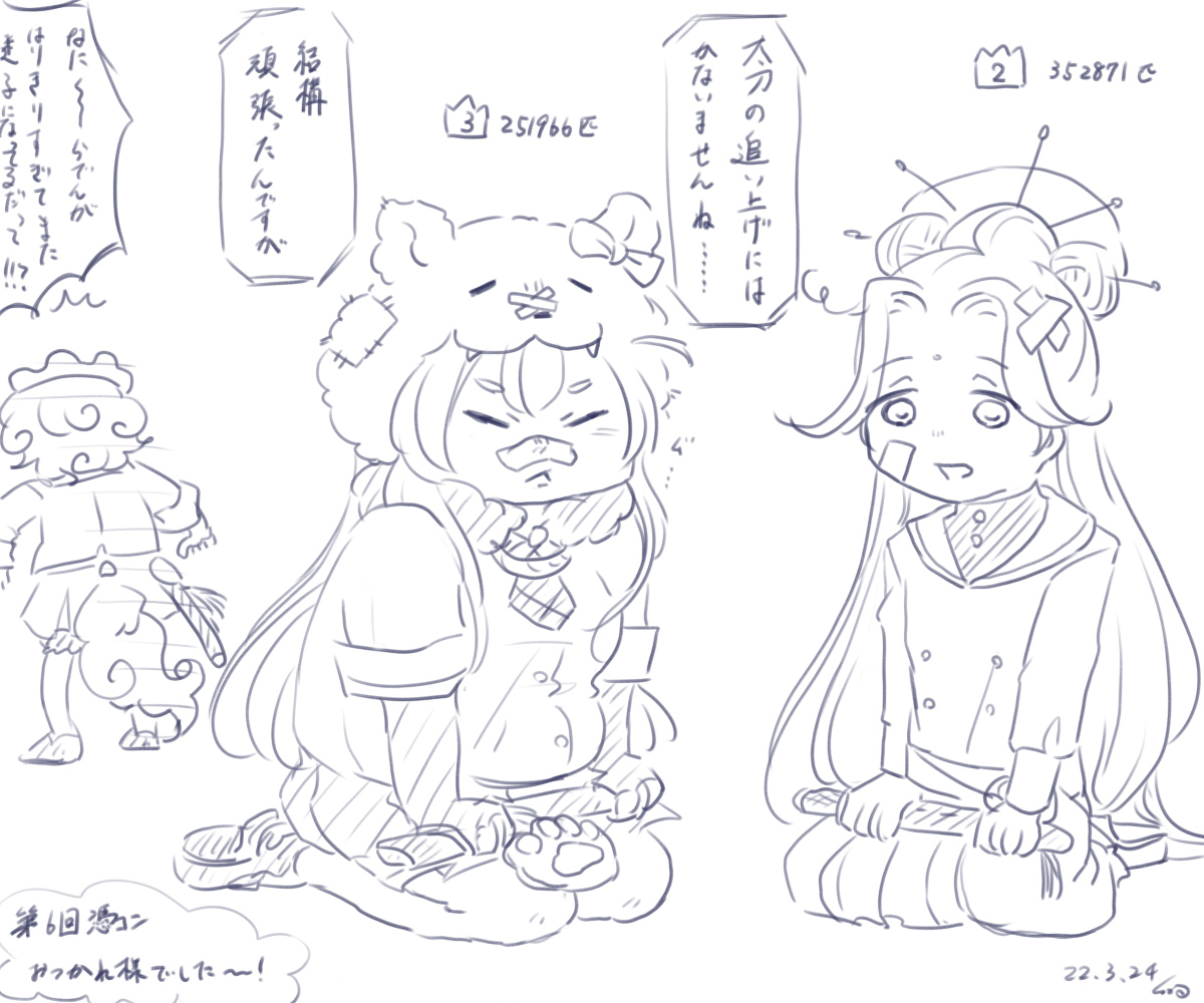 3 10 追い上げすごくてビックリしたけどたいまさん大健闘よ、でも超悔しいので既に6人育成してるけど増やそうかな………… #しんけん魁イラスト 22/03/24 19:01
