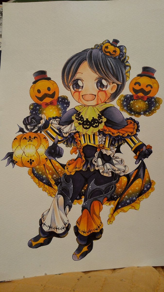 1 9 #フォロワーさんからイメージもらって自分をハロウィンキャラ化する #コピック ジャック・オ・ランタン 血の涙、コウモリ ひらひらフリル多めの衣装 去年のですが今となってやっと完成しました💦 20/10/21 00:53
