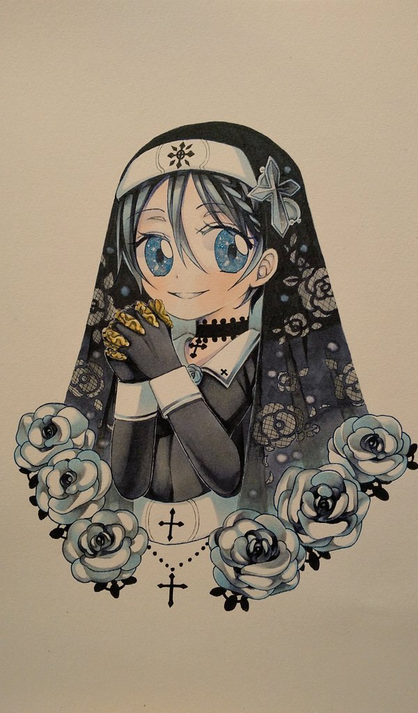 #コピック 漆黒のシスター 以前アンケートいただいた要素をまとめて描きました💝 ありがとうございます!! 髪短めの編み込み、シスター、ラメ入りの瞳、十字架、チョーカー、ゴシックベール、薔薇、おしゃれな鉤爪 今年最後の描き収めになります✝️