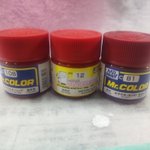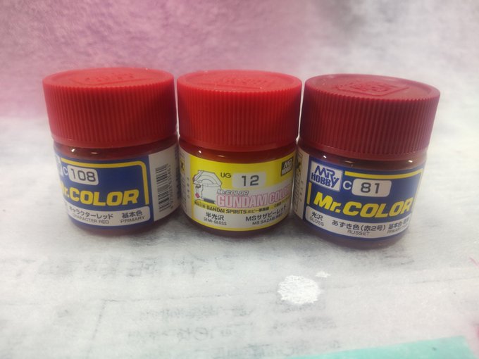 RGサザビー8日目。 塗装の続き。 装甲にはこの3色を用意。 メインにサザビーレッドを使って、それよりちょっと明るいのとちょっと暗いのを。 #ガンプラ #ガンプラの画像貼るとRTされると聞いて