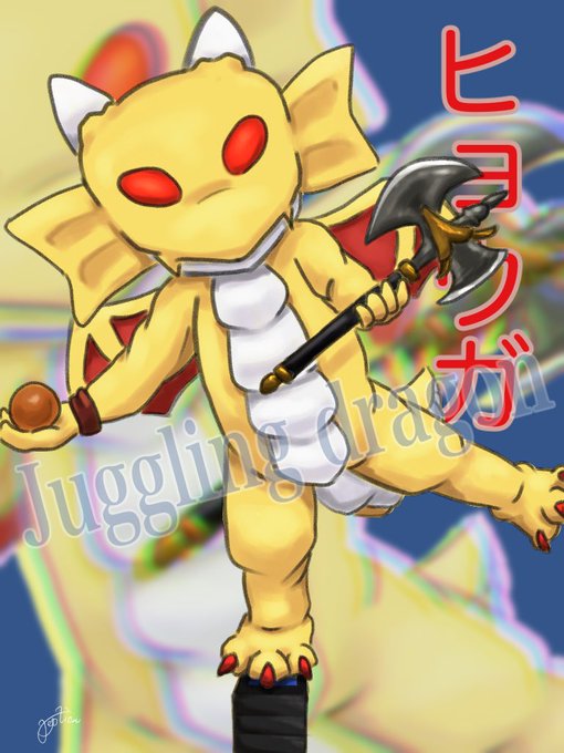 静岡県浜松市に生息する、ジャグリングドラゴン。ヒョウガさん。 またの名を餃子ドラゴン(氷属性なのに) 最近は大道芸だけでなくゲーム制作もしてる様子……。 実は生ヒョウガさん見たことないんですよねえ( ;∀;) #ヒョウガのヒョウ画 #芸人 #私の好きな方 #ジャグリングドラゴン #イラスト