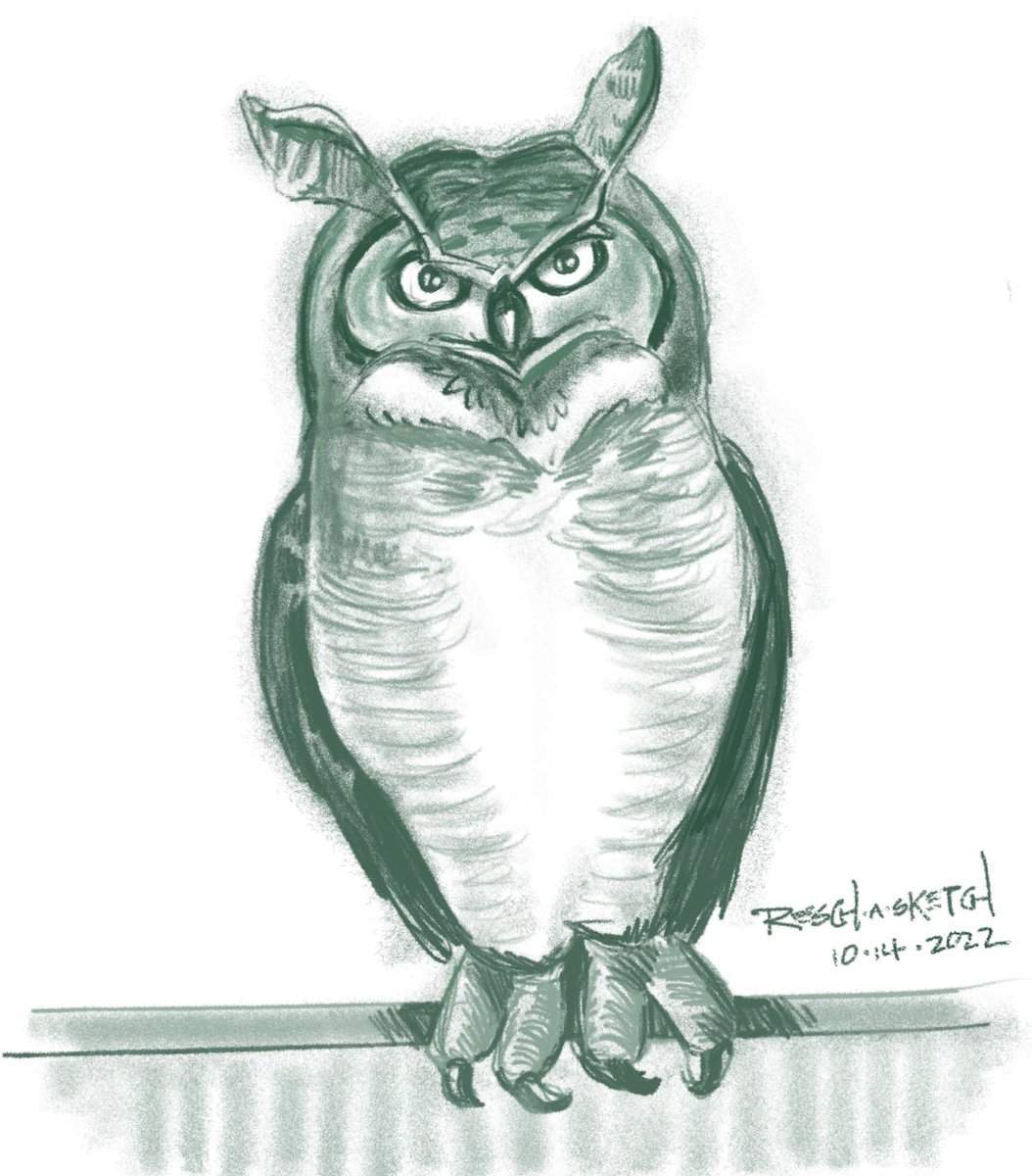 A welcome, if surprising, daytime backyard visitor. From a great shot my wife Brooke got before he spread those massive wings and flew away. #owl #amdrawing #kidsbooksillustration #illustrator #kidlitart