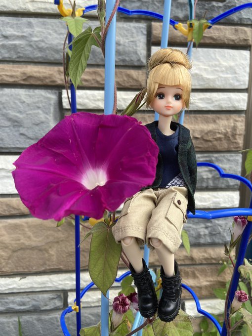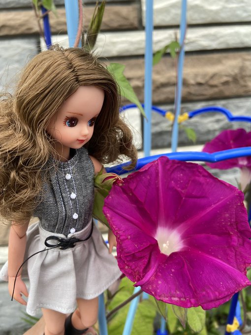 1 23 おはようございます(*´▽`)ノノ 娘氏の朝顔が綺麗に咲いてたので、イヴちゃんと(∩´∀`∩)💕✨ #おはドル #リカ活 #カスタムリカちゃん 22/08/14 09:22