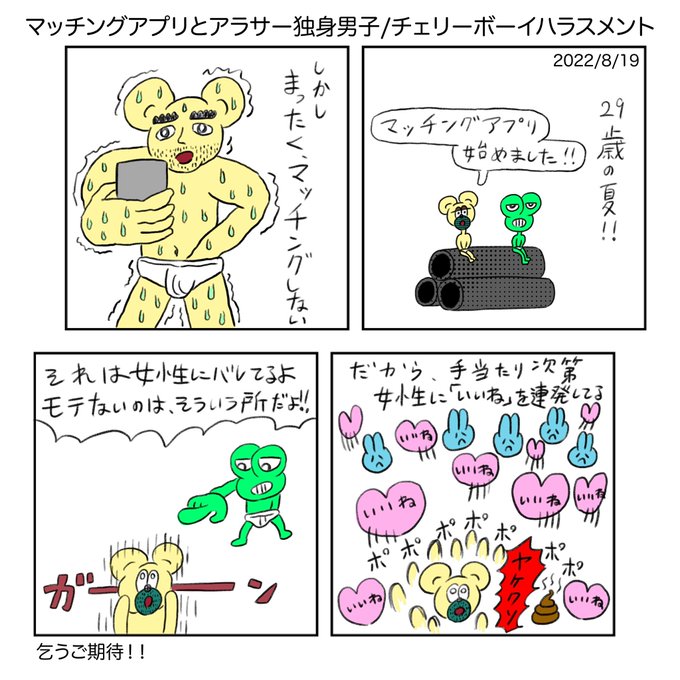 1 1 マッチングアプリの「いいね」について。 【パイプパークのチェリーボーイハラスメント】 #漫画が読めるハッシュタグ #マッチングアプリ twitter.com/retaro2020/s… 22/08/21 21:58