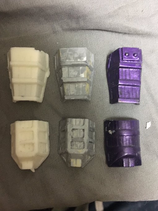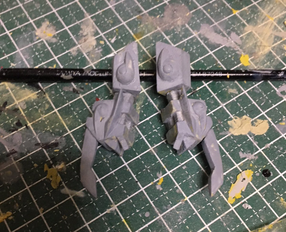 もう塗装に入っとかないとマズイですが複製しました。肩のパーツと腰のパーツです。色を塗ってるヤツと比較すると解るんですが目で見た時に逆ハの字になるのを直し、腰を設定画に近づけました。