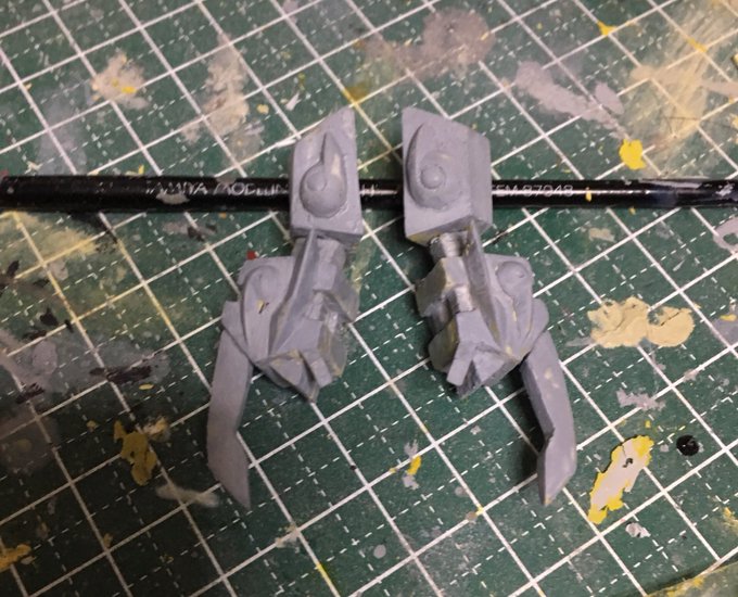 0 30 もう塗装に入っとかないとマズイですが複製しました。肩のパーツと腰のパーツです。色を塗ってるヤツと比較すると解るんですが目で見た時に逆ハの字になるのを直し、腰を設定画に近づけました。 19/03/18 19:00