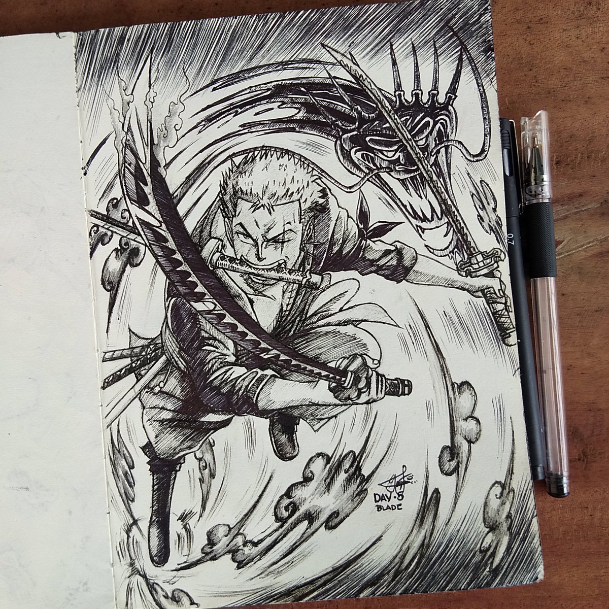 DAY 5: "BLADE" Roronoa Zoro • One Piece "3 Sword Style" 10•5•20 🖋Ink Pen X Sketchbook #inktober #inktoberday5 #inktober2020 #inktoberchallenge #artsy #inkart