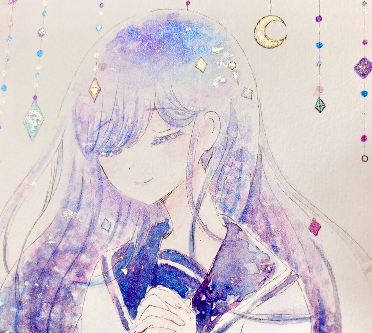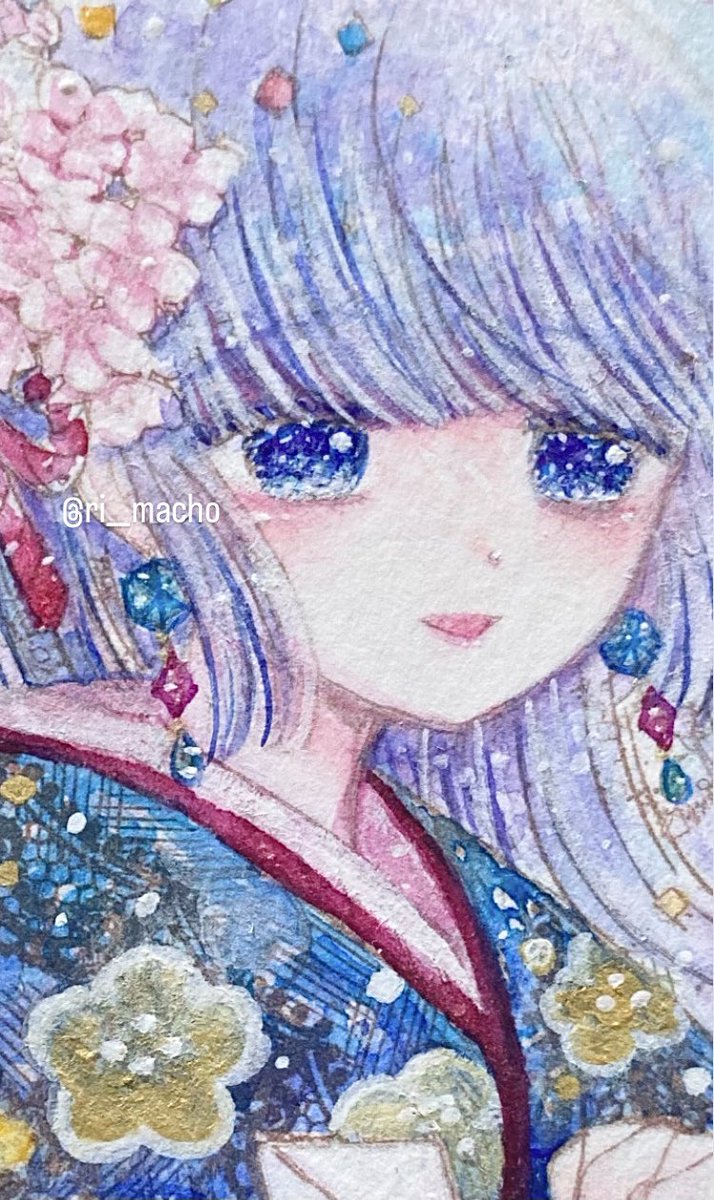 久しぶりに透明水彩で塗りました🌸 光を当てるとキラキラ光る絵の具で瞳や着物を加筆しています✨ 絵の具は、まっち、ホルベイン、ファインティックを使用しています。 #アナログイラスト #絵描きさんとつながりたい