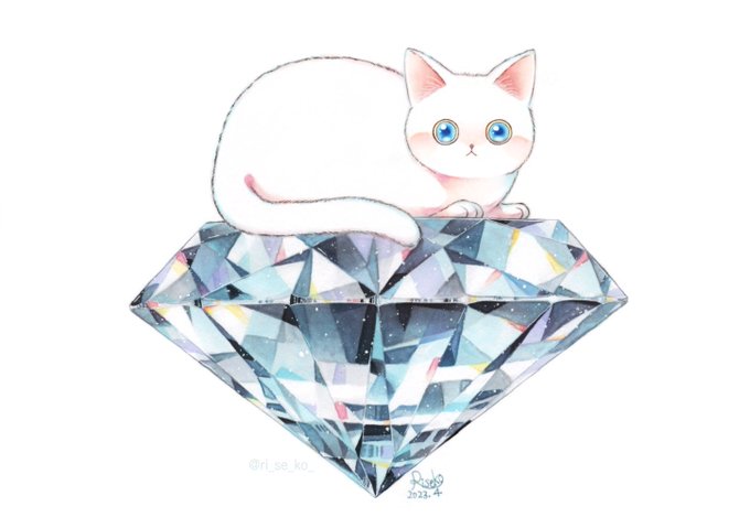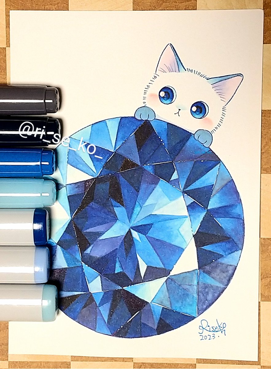 24 110 『猫と誕生石💎』 4月 ダイヤモンド #コピック #アナログイラスト 23/04/23 17:07