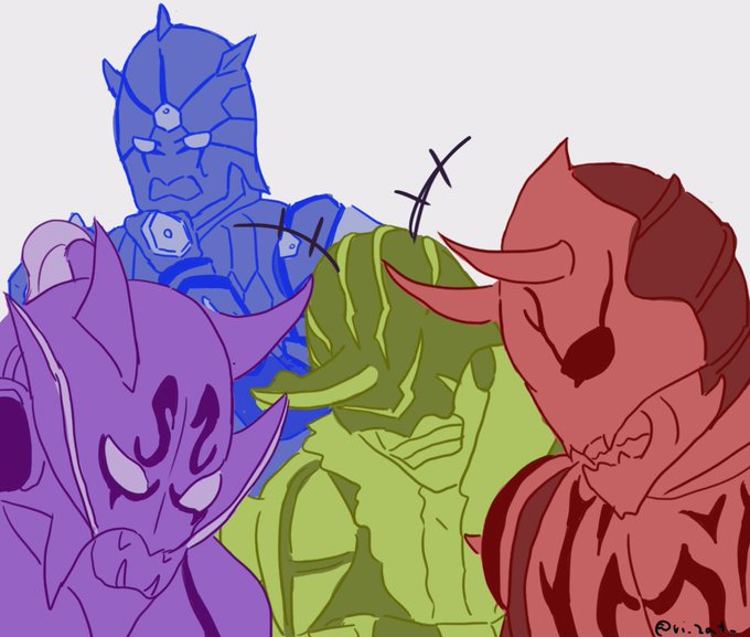 ③ 🐲「見て見て〜!蝉さん!」 🍑「うぉ!滅茶苦茶でけぇじゃねぇか!」 🐻「見た事のない蝉やなぁ!」 🐲「でしょでしょ〜!」 🐢「(……絶対会話に混ざりたくない)」 #特撮版深夜の真剣お絵描き60分一本勝負R