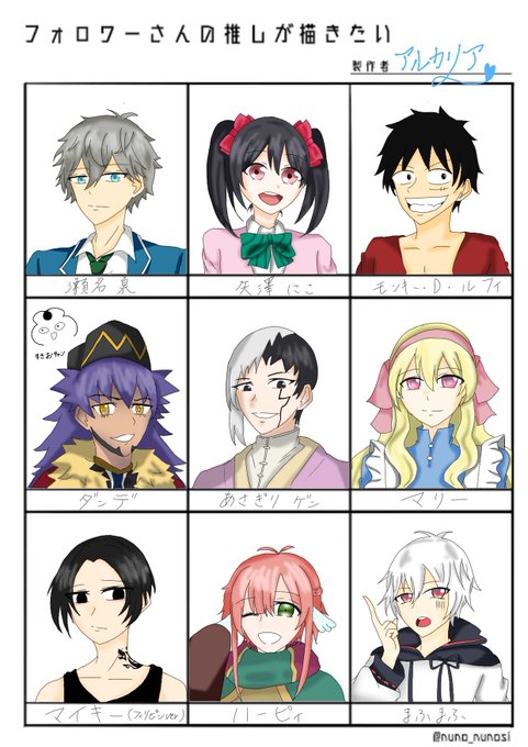 大変お待たせしました!(✘д✘๑;) ³₃ リクエスト全てでは無いけど1枚目完成しました!!(描く順番はリプの順番と関係ないです)初めて描くキャラが多かったので…あまり似てないって思うかも…許して( ´・ω・`) #絵描きさんと繋がりたい #フォロワーさんの推しが描きたい