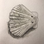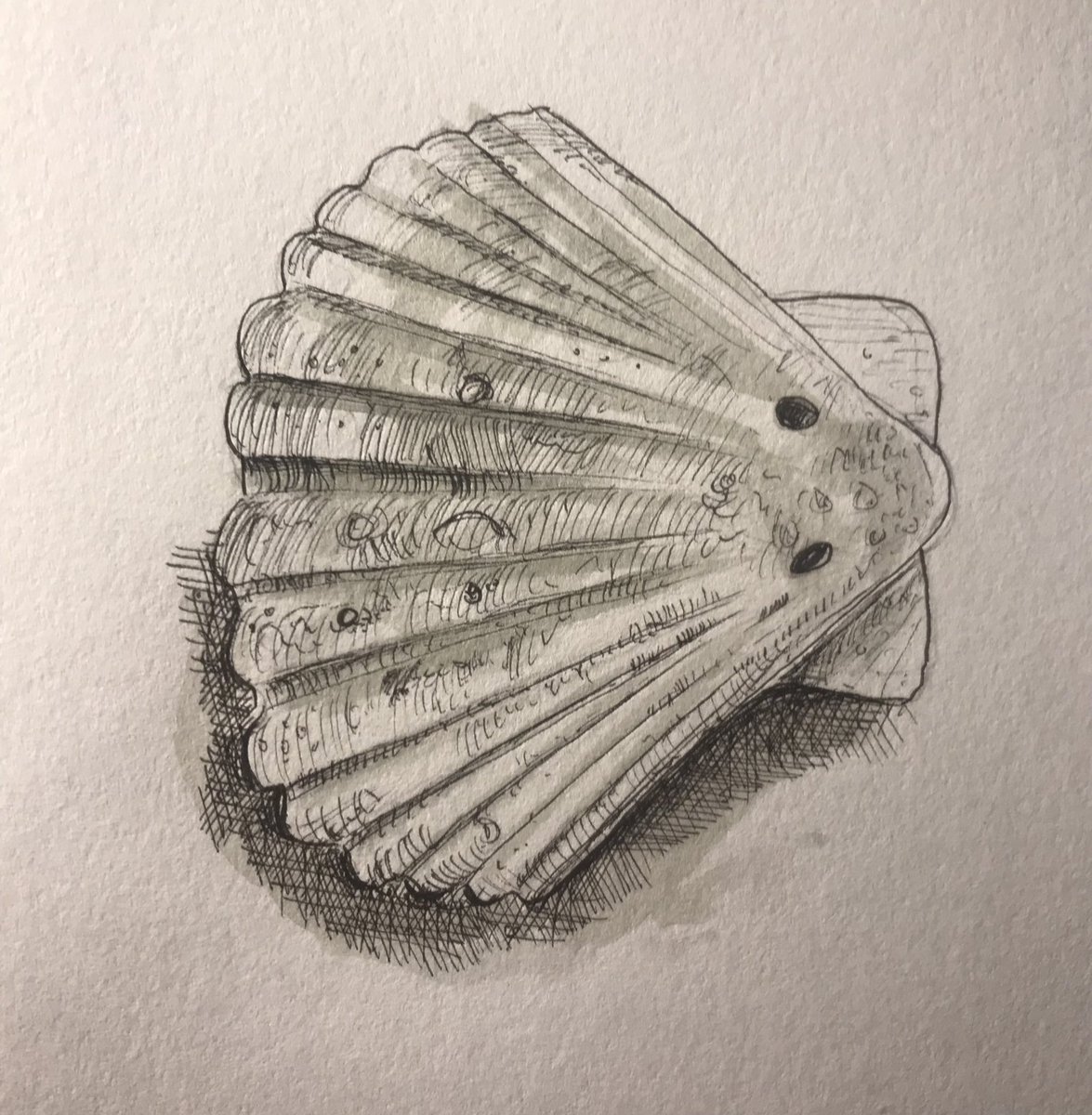 #inktober2022 4)Scallop. Archaeologists at the @_UoW found this scallop shell amulet in the medieval grave of a man at St Mary Magdalen hospital perhaps indicating that he had been on pilgrimage to Santiago de Compostela #Archaeology