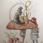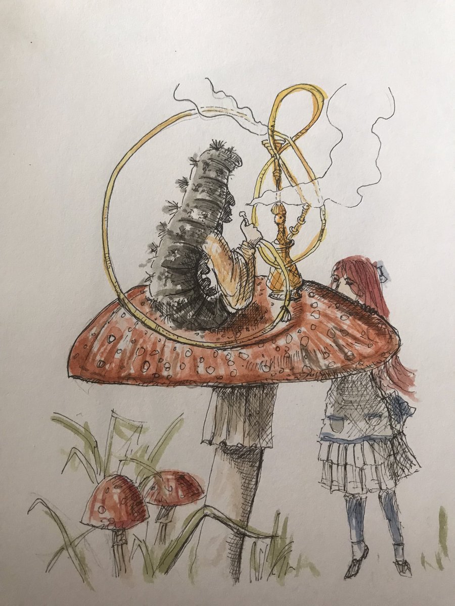 #inktober2022 6)Trip. Doesn’t get trippier than the caterpillar in Alice in Wonderland! My old tutor, Prof Andrew Sherratt made a tv series called ‘sacred weeds’ administering fly agaric to people to see what art they came up with - prehistoric? Genius! Different Alice too obvs!