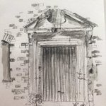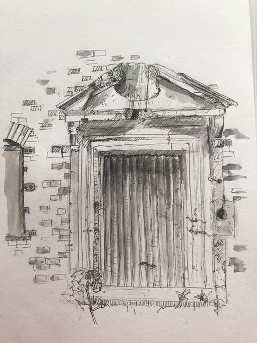 #inktober2022 14) Empty. The back door to the now empty Imber Court on Salisbury Plain. Now an incredibly busy training area for the army, the house still holds ghosts of past villagers, the door closed with corrugated iron. The archaeology of this village would be fascinating….