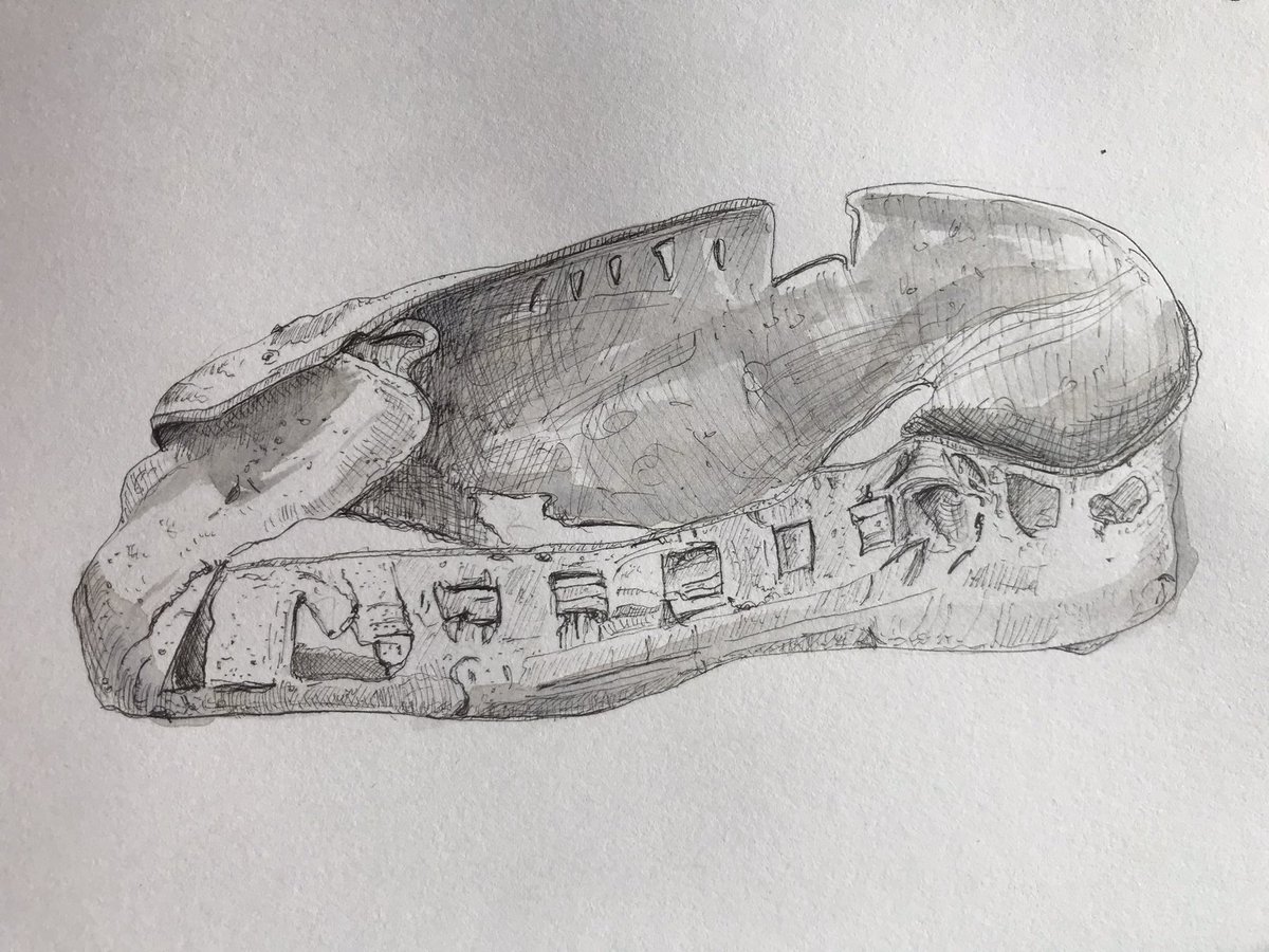 #inktober2022 17) Salty. This shoe - some 2700 years old - was found in the ancient salt mines of Hallstatt in Austria. Not only was the person mining salt, they were probably walking on salt and sweating whilst working. Possibly the saltiest thing ever! Hallstatt is fab btw