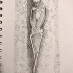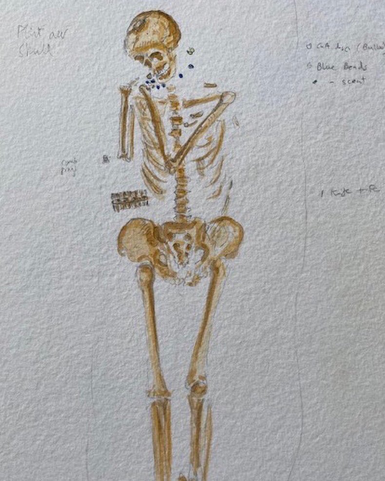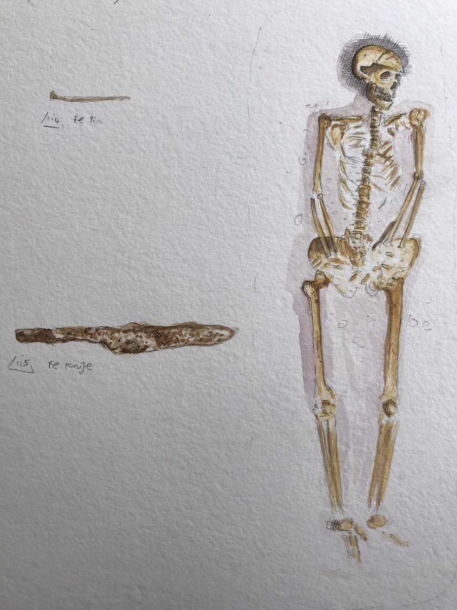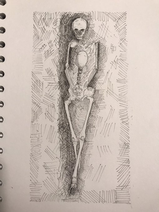 #inktober2022 23)Booger. a silly word so I’m doing the #archink alternative, ‘Burial’. A sketch of a grave from Avon camp on the Plain this year. FOUR people in the grave with the final burial having a skull over their chest. other sketches from field notebook for good measure!