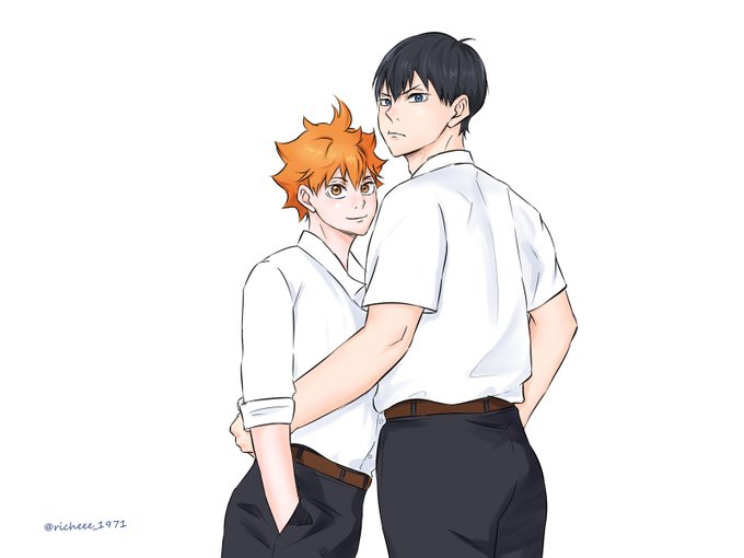 お題「腰に手を回す」 もう1つ描いたー! こいつスゲーだろ?俺のもんだけど!相手チームに見せつける👑w #影日ワンドロ @kagehina_d_w