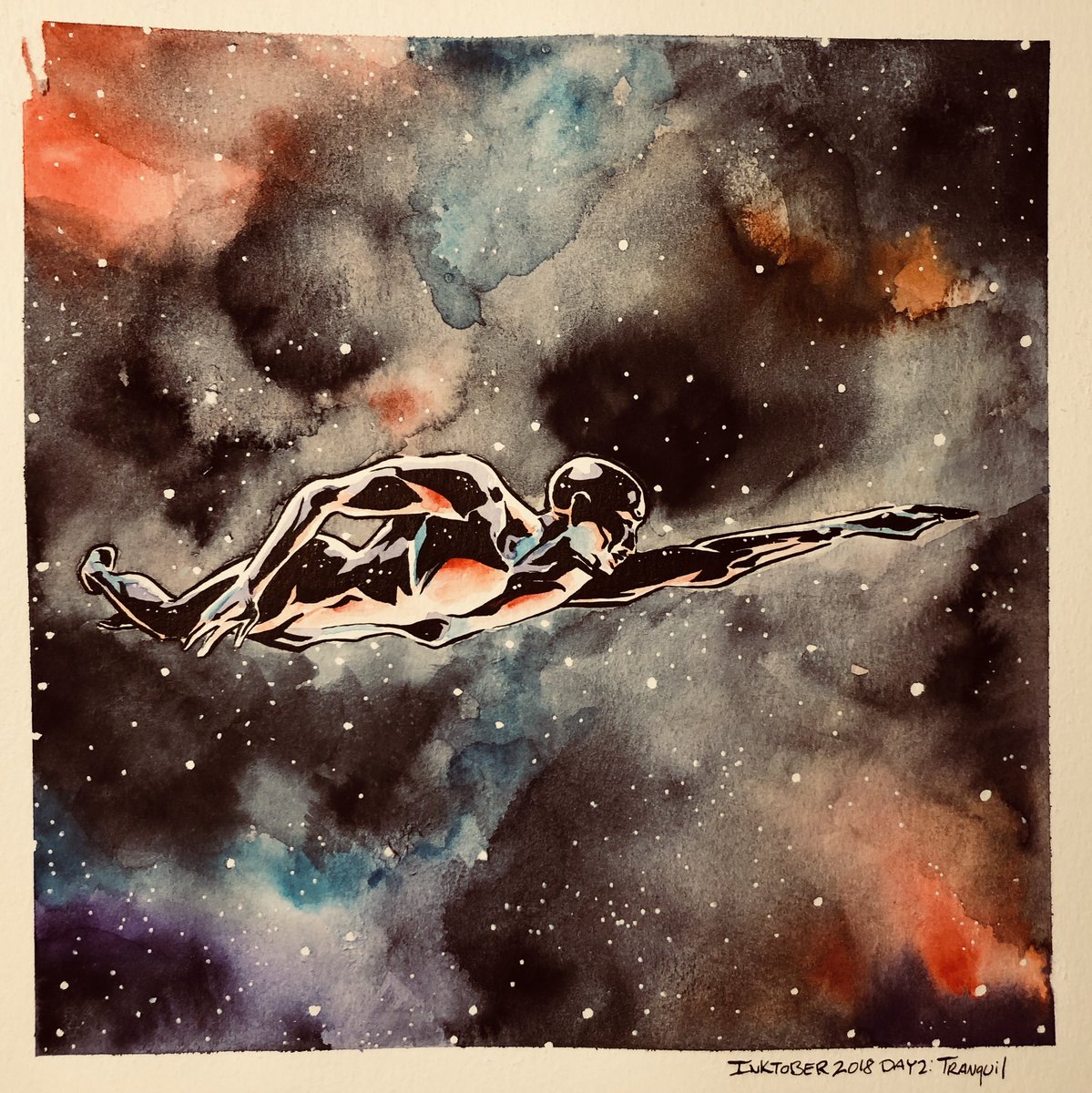 1 7 Inktober day 2: Tranquil I imagine swimming through space in a chrome suit would be awesome. . .. #inktober #inktober2018 #inktoberday2 #illustration #doodle #watercolor #brushpen #drawing 18/10/03 00:58