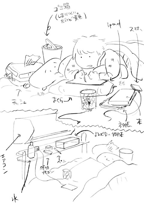 作業環境 よく寝落ちて枕の少し下で丸まって寝ています。ロフトベッドなんですが半分くらいしか使ってないかも。座ってやらなきゃと思うが。