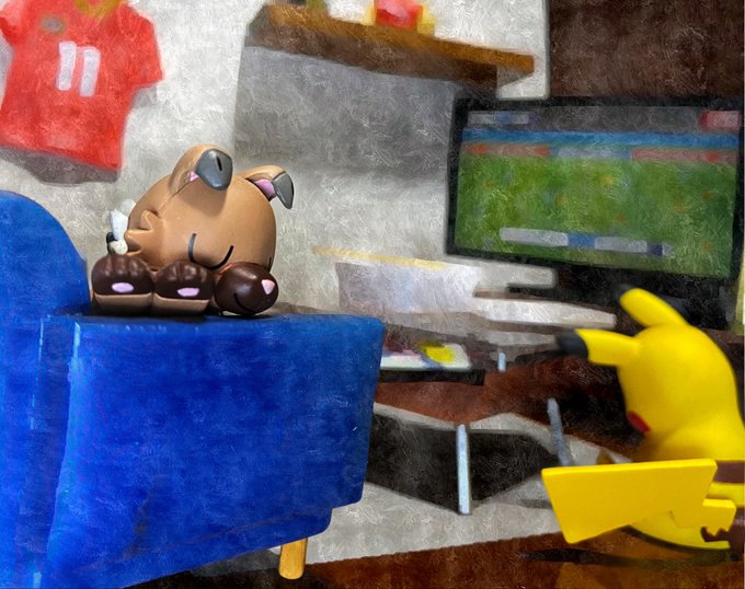 (やれやれ、一人暮らしで2匹の世話は大変だなぁ😌) #オモ写 #ポケモン #ピカチュウ #イワンコ #ポケモンのいる世界