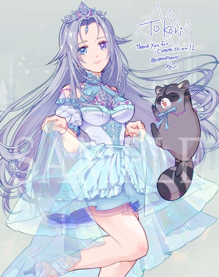 skeb納品いたしました! 氷のお姫様というコンセプトのキャラクターでしたが、とても華やかで煌びやかなデザインなので、あまり冷たい印象になり過ぎないようにしてみました。マスコットのアライグマくんが可愛いです🦝💕ご依頼有難うございました!!skeb.jp/@rightleftagon… #Skeb #Commission