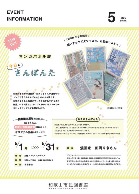 【告知】地元和歌山の図書館で「今日のさんぽんた」の展示をやっていただくことになりました! 5/1〜5/31です! 描き下ろしマンガもあります! wakayama.civic-library.jp/event/exhibiti…