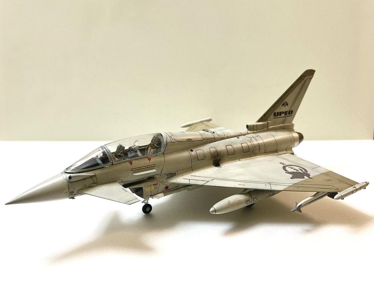 もう時間ないから完成てことでw レベル1/72ユーロファイター タイフーン複座型です。現用戦闘機真面目に組んだの初めてだったので、諸々苦労しましたが出来たらカッコいいです。ちょいエスコンがマイブームだったので3のUPEO、サーフ所属機にしました。個展で見てねw #今月作ったプラモ晒そうぜ