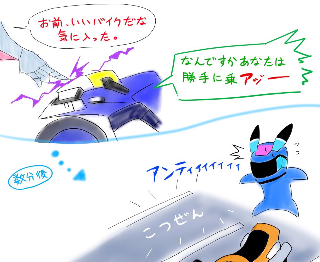 3 2 #バイクの日 なので バイクに乗ってみたかったジーク落書き 某所でスティールガンナー2のジーク戦のBGMがサイバーサイクルズのデモBGMに似てるとのコメを見て湧いたネタ。 私の脳内ではアンティアスはAI付きだけどジークは半機械だからハッキングとかできそうと思って 20/08/19 22:33