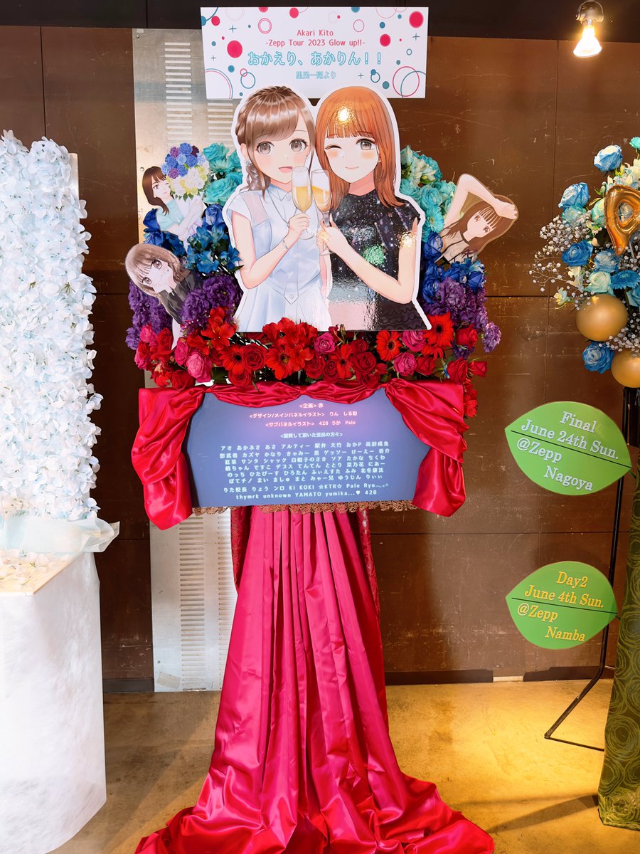 『鬼頭明里 ZeppTour2023 Glow up!! 名古屋公演 』赤さん企画のフラスタにて全体的なデザイン、メインパネルの方で参加しました✨ 全体的お花、参加者ボードはGlow up!!感を! イラストは「おかえり」って気持ちを込めて1stの衣装を描きました! 皆さんほんとお疲れ様でした‼️☺️ twitter.com/s_r_k0730/stat…