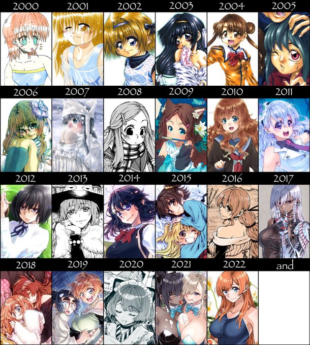 絵柄変遷22年分。もう今の絵柄になって10年ぐらいだから、今後は変なバランスにならないようにだけ気を付けてアップデートしていきたい。