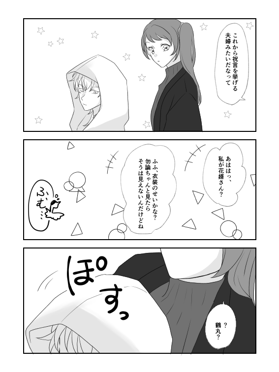 16 90 ※鶴さに 顔有創作🚺審神者います ノリの良い鶴丸さん 光忠「…主、大丈夫? 何か目覚めたりしてない?」 23/03/24 17:24