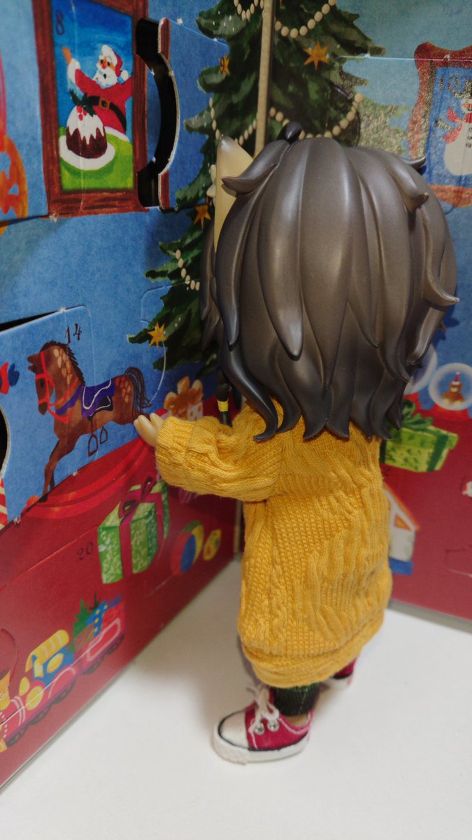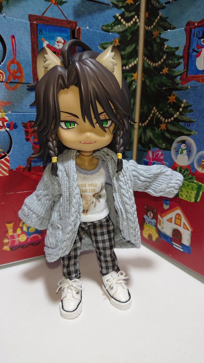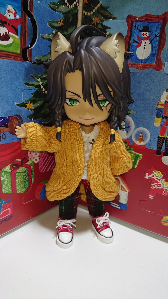 今日はオールインワン×カーディガン×赤スニーカー🎵 暖かい服装で😉👍️ アドベントカレンダー23日目… 🦁「チョコだ」 え、明日だと思ってた‼️ 👕👖Cワールド様(@hironami_loid) 👕せさみ様 (@sesameyoi) 👟シノクローゼット様(@shino_closet ) #twstドール部 #ねんどろいどどーる #レオナと一緒