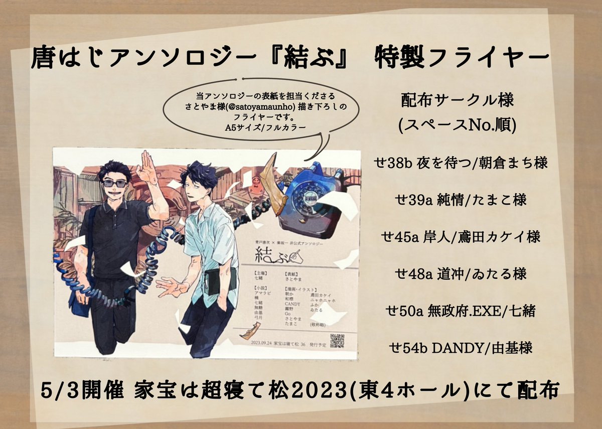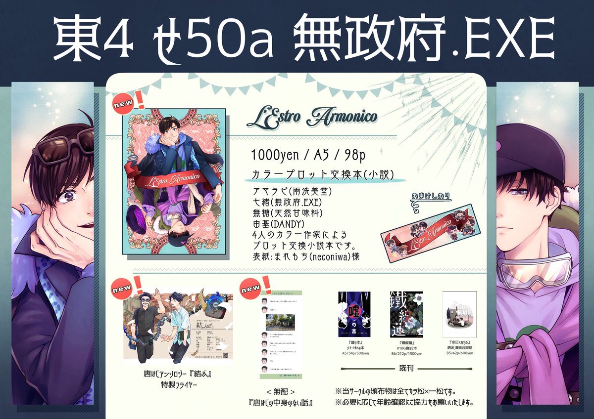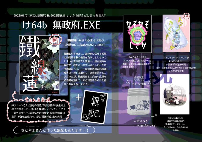 家宝は超寝て松2023/からいっち12 お品書き | 七緒 #pixiv pixiv.net/artworks/10767… お品書きです!まれもちさんのデザインと無糖さんの紹介文という超豪華コラボです…震えてしまう プロット交換本もフライヤーも本当にすごいの一言なので、今までで一番緊張するイベントかもしれません 頑張ります
