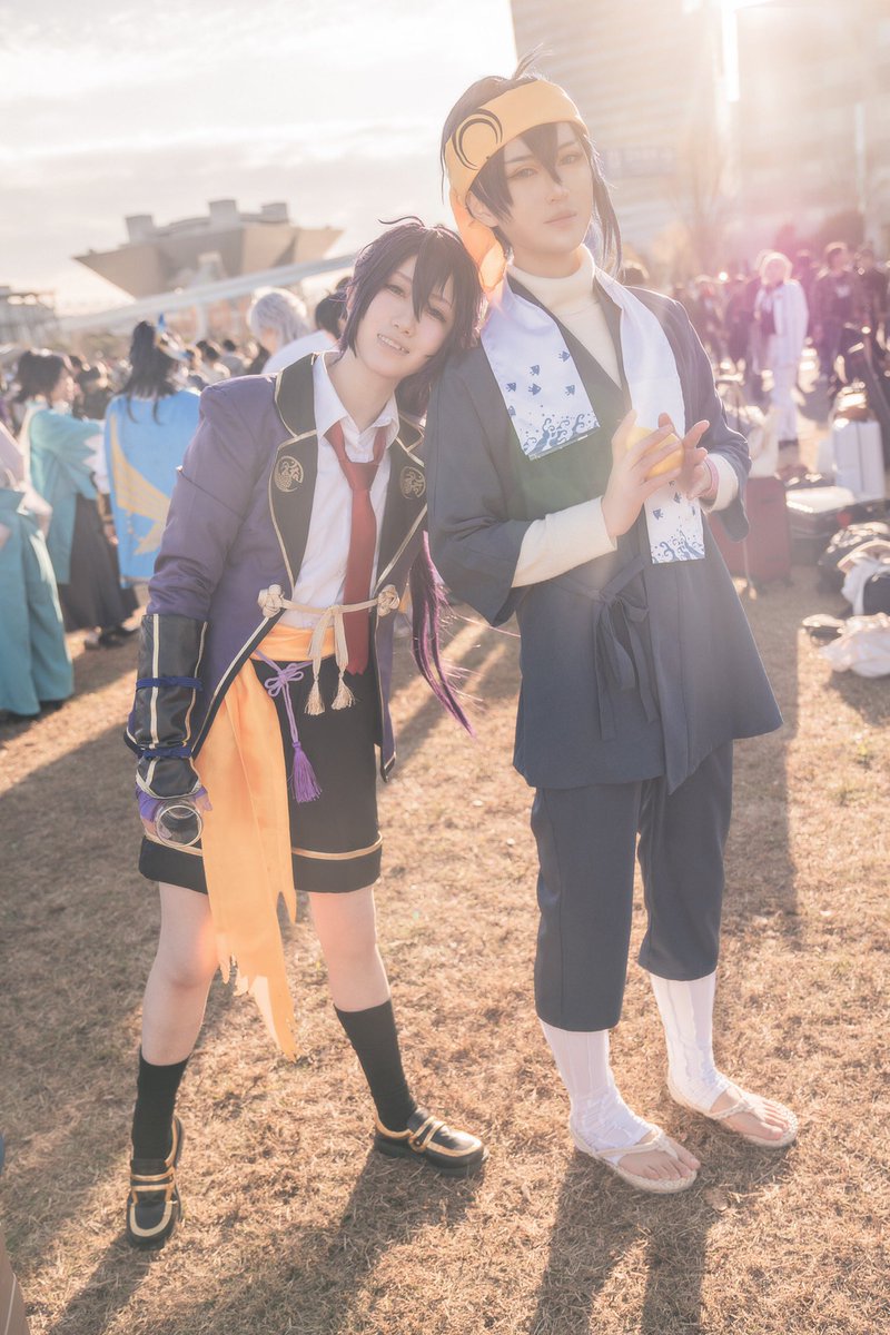 2 6 #C97コスプレ #刀剣乱舞 #刀剣乱舞コスプレ 不動行光:@jun_66666 三日月宗近:@xMiAx27 photo by me 夕日がとても綺麗です🌇 19/12/30 17:47