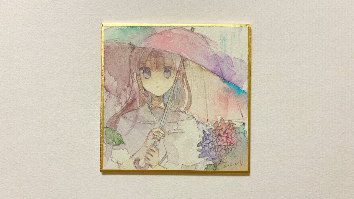 . 相合傘のきみを見た . 透明水彩、色鉛筆(76×76mm) #創作 #イラスト