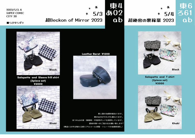 14 25 SUPER COMIC CITY 30 5/3▶︎超Beckon of the Mirror 5/4▶︎超秘密の裏稼業 スペース頂きました!両日参加! まーき&あんずと一緒です😚😚😚 サロペ/シャツ/レザーベレーとかとか頒布予定です! 23/04/10 22:25