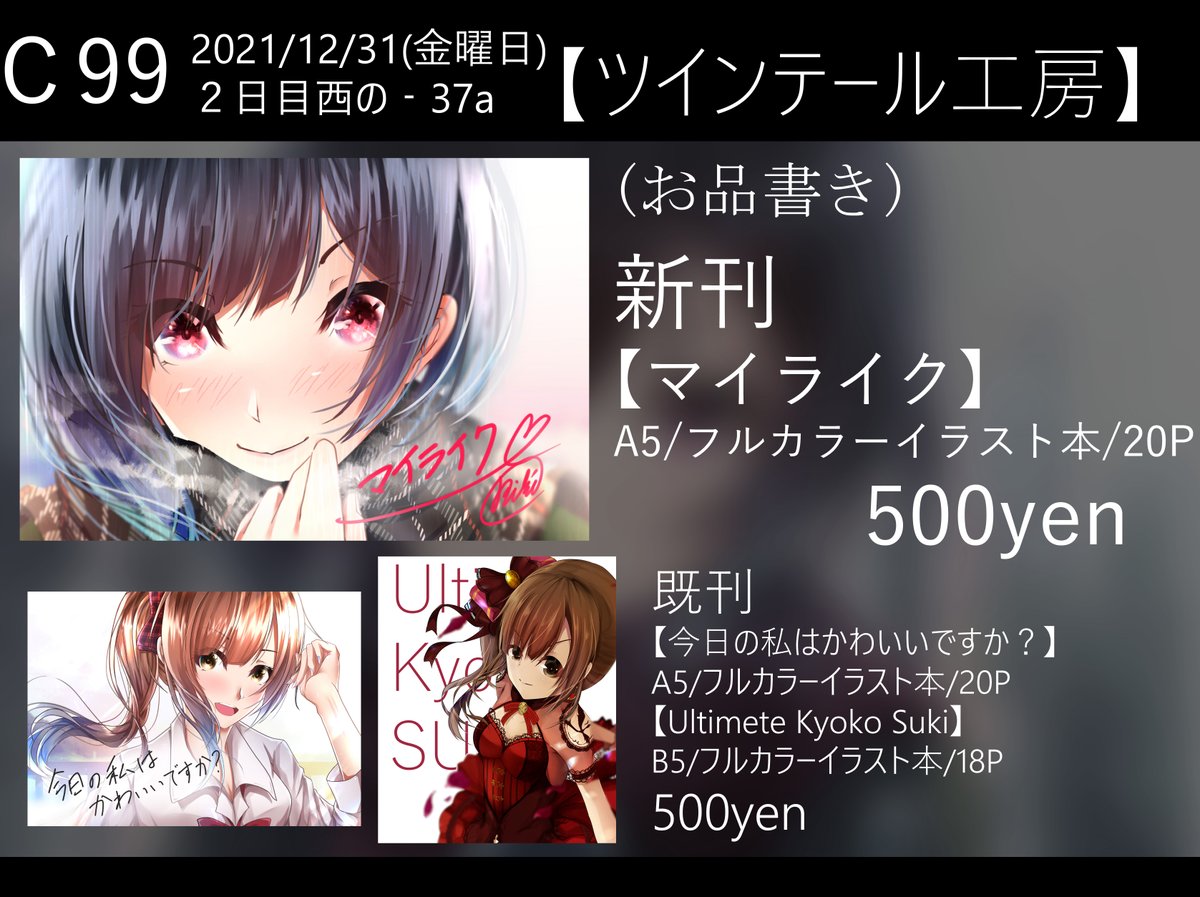8 9 C99お品書きです。 イラストまとめ本です。よかったら気軽に遊びに来てくださいお待ちしております! 21/12/29 23:49