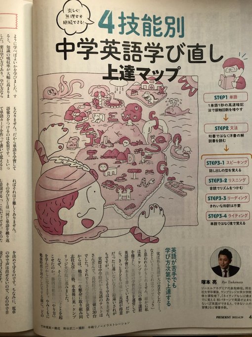 発売中のプレジデント2022.4.29号の中学英語学び直し という記事のイラストを担当致しました。 ピコ太郎のネタがギリギリ理解できる程度の英語力のボクですが、目からウロコの記事でした。 毎回よい感じにイラストを使って下さって嬉しいです。 #イラスト依頼募集中 #イラスト好きな人と繋がりたい