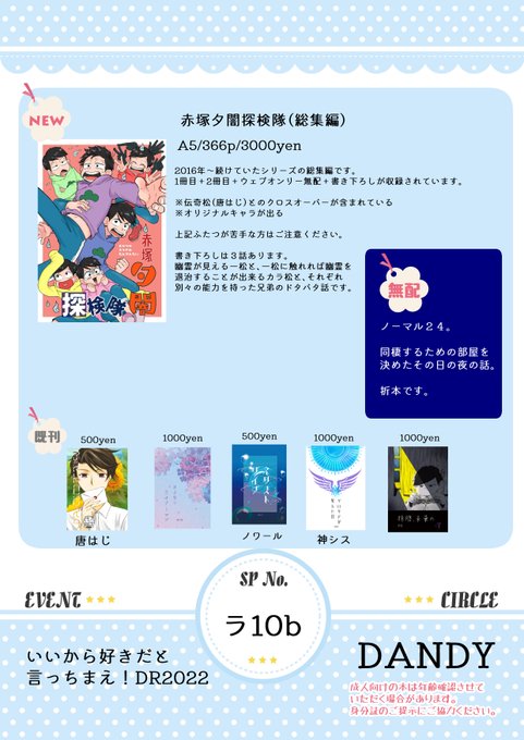 【5/3家宝は超寝て松】お品書き【カラ一】 | 由基 #pixiv pixiv.net/artworks/10767… お品書き作りました!なんとテンプレもまれもちさんが作ってくれたという……✨ 東4ホール せ54b DANDY にてお待ちしております!無配は書けたら持っていきます。