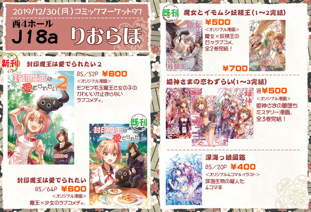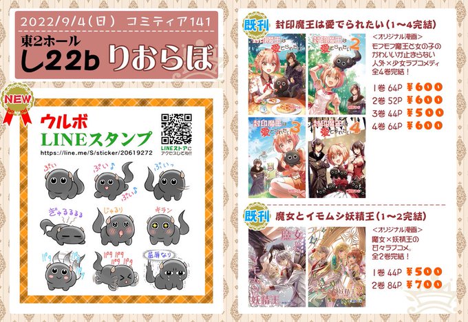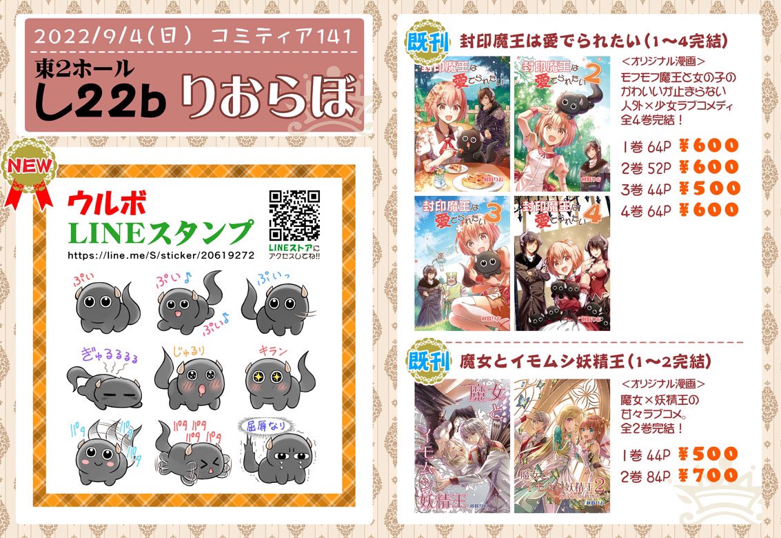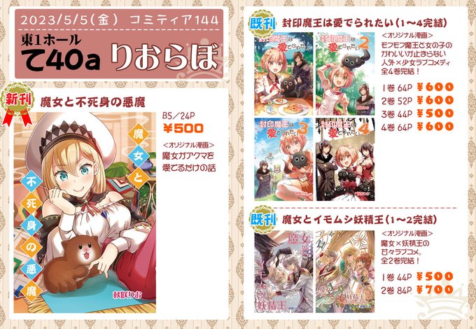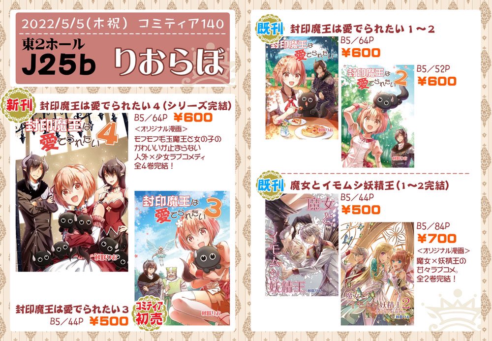 5/5 コミティア140のお品書きです〜( ⸝⸝•ᴗ•⸝⸝ )੭⁾⁾ 新刊は、『封印魔王は愛でられたい4巻』です! 東2ホールの【J25b】 入り口すぐのところ(੭˙꒳˙)੭ よろしくお願いします! #COMITIA140 #コミティア #お品書き