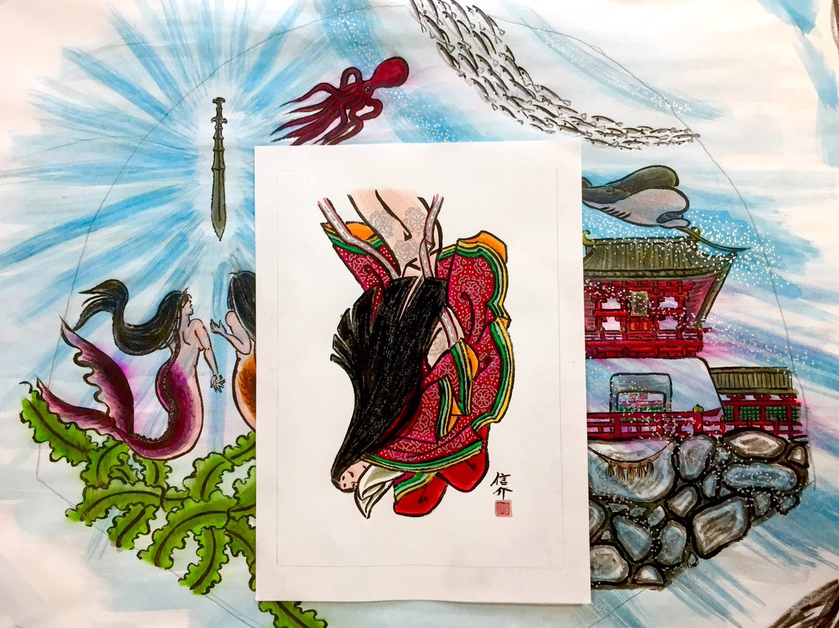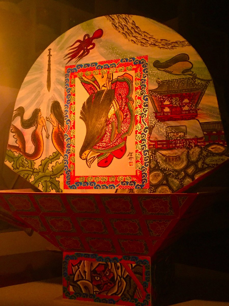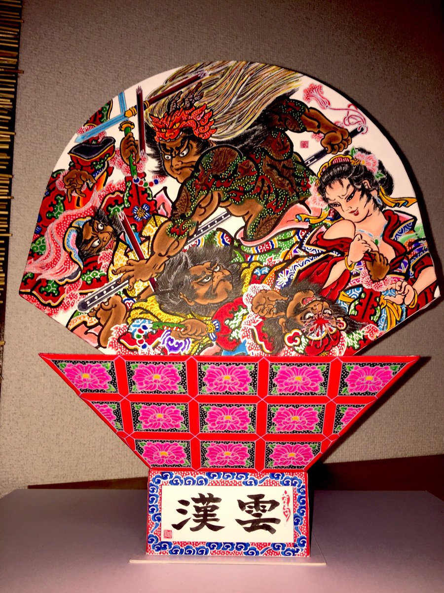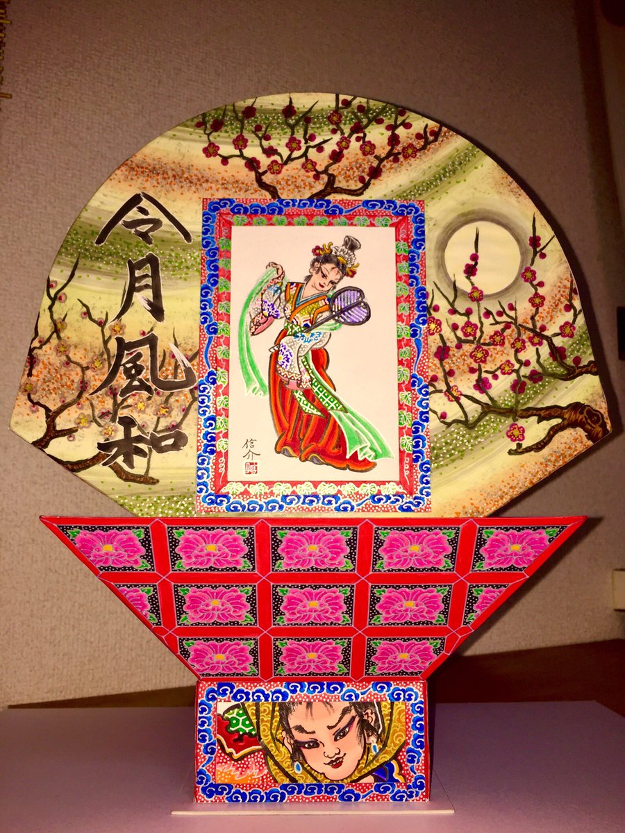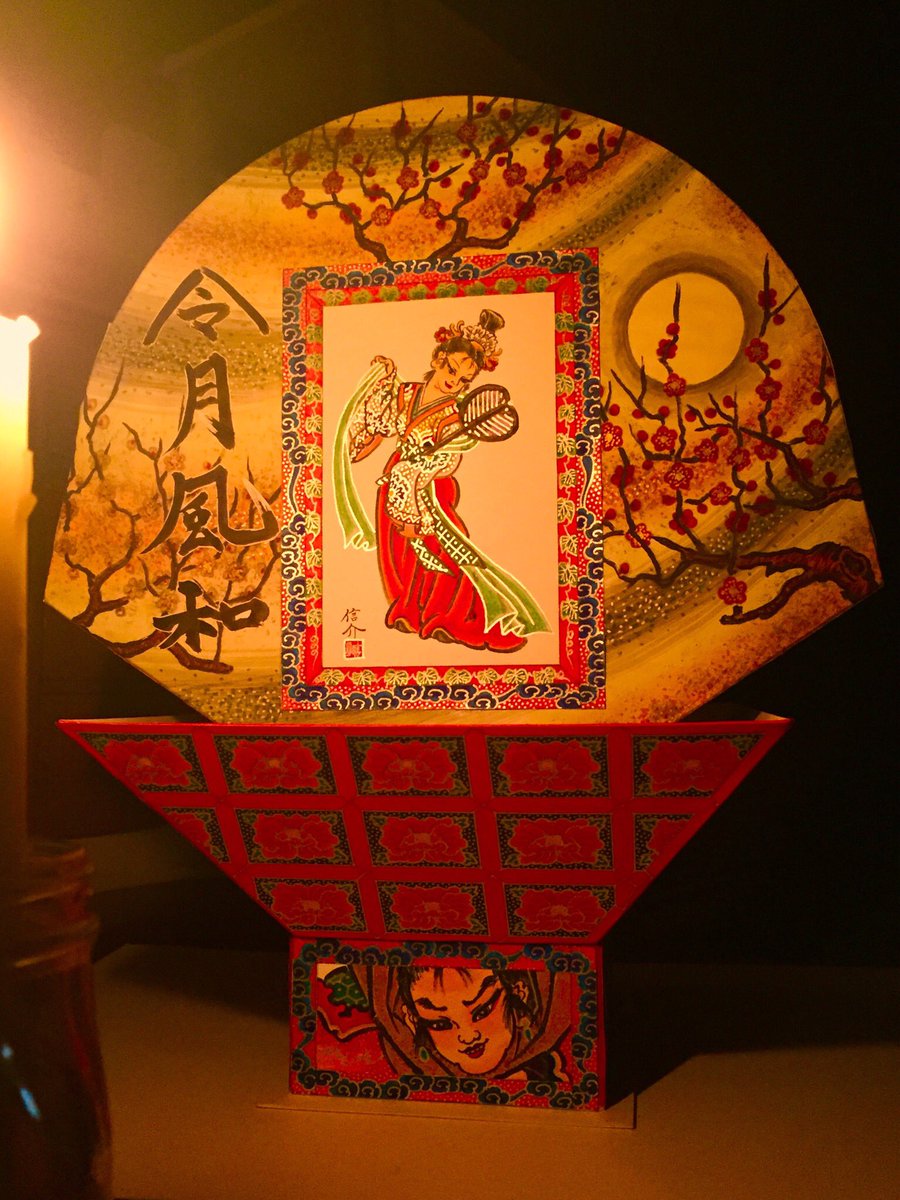 厚紙製ペーパークラフトねぷた 高さ33㎝ 幅28㎝ 奥行き21㎝ 扇厚み10㎝ 2019年7月完成 鏡絵「水滸伝 九紋龍史進、力闘の図」 見送り「天平美人」 袖絵「令和紅梅図」 #おうちでねぷたまつり #ペーパークラフト #ねぷた