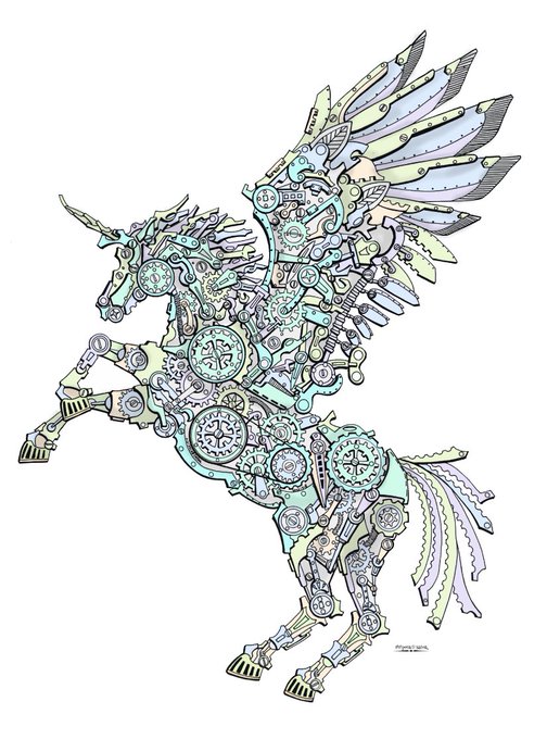 おはようございます(о´∀`о) 今日もよろしくお願いします♪ ⚙ペガサス⚙ #スチームパンクイラスト #歯車イラスト #ペン画 #ペガサス #作品をみてくださいあわよくばフォローしてください祭
