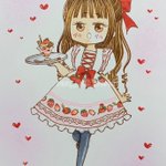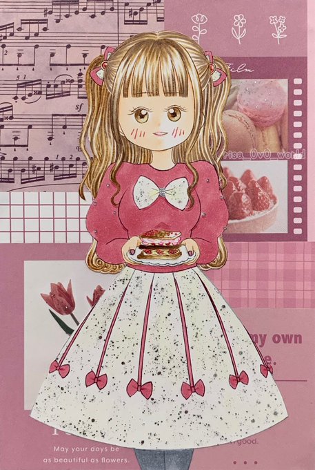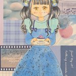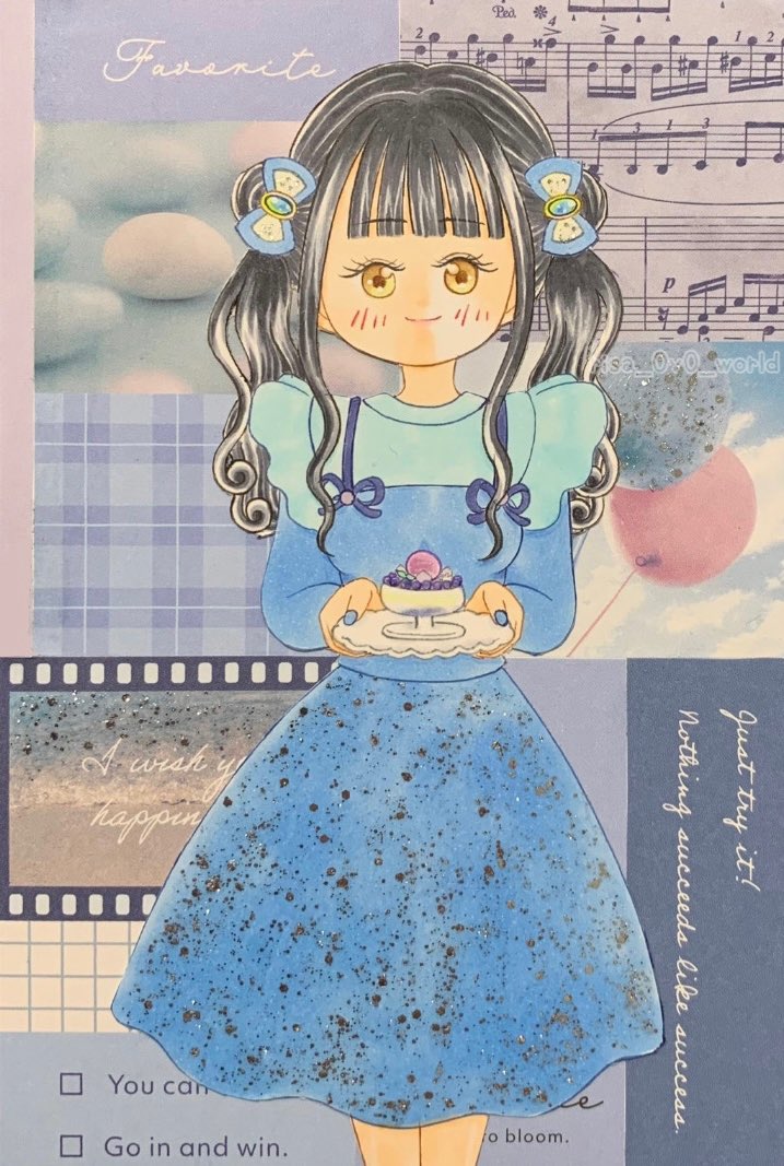 記念イラスト、さらに続きます(*´罒`*)ニヒヒ♡︎ 今回も背景はseriaのデザインペーパーをコラージュしたものです! 持ってるスイーツはFUKUNAGA901さんの、ぶるーべりー畑💖 見た目もすごく可愛いわお味も最高だわの満点パフェでした゚.+.(♥︎´ω`♥︎)゚+.*.。 #イラスト #illustraion